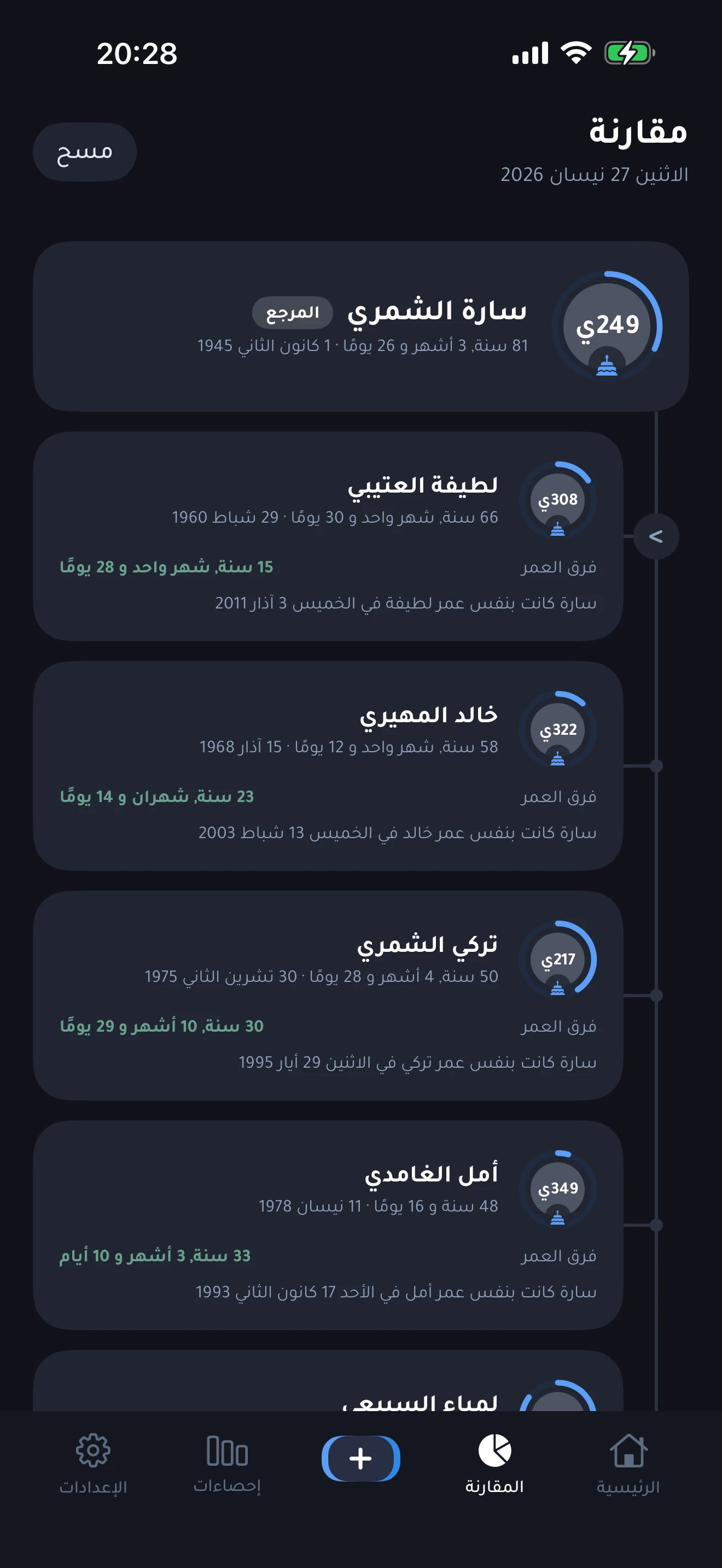 عرض المقارنة مع بطاقةٍ مرجعيّةٍ مثبَّتة وأربع بطاقاتٍ أخرى مرتَّبةٍ على خطٍّ زمنيٍّ عموديّ، تُبيّن لكلّ منها فارقَ العمر بدقّةٍ والتاريخَ المستقبليَّ الذي يَبلغ فيه الشخصُ المرجعيُّ العمرَ نفسه