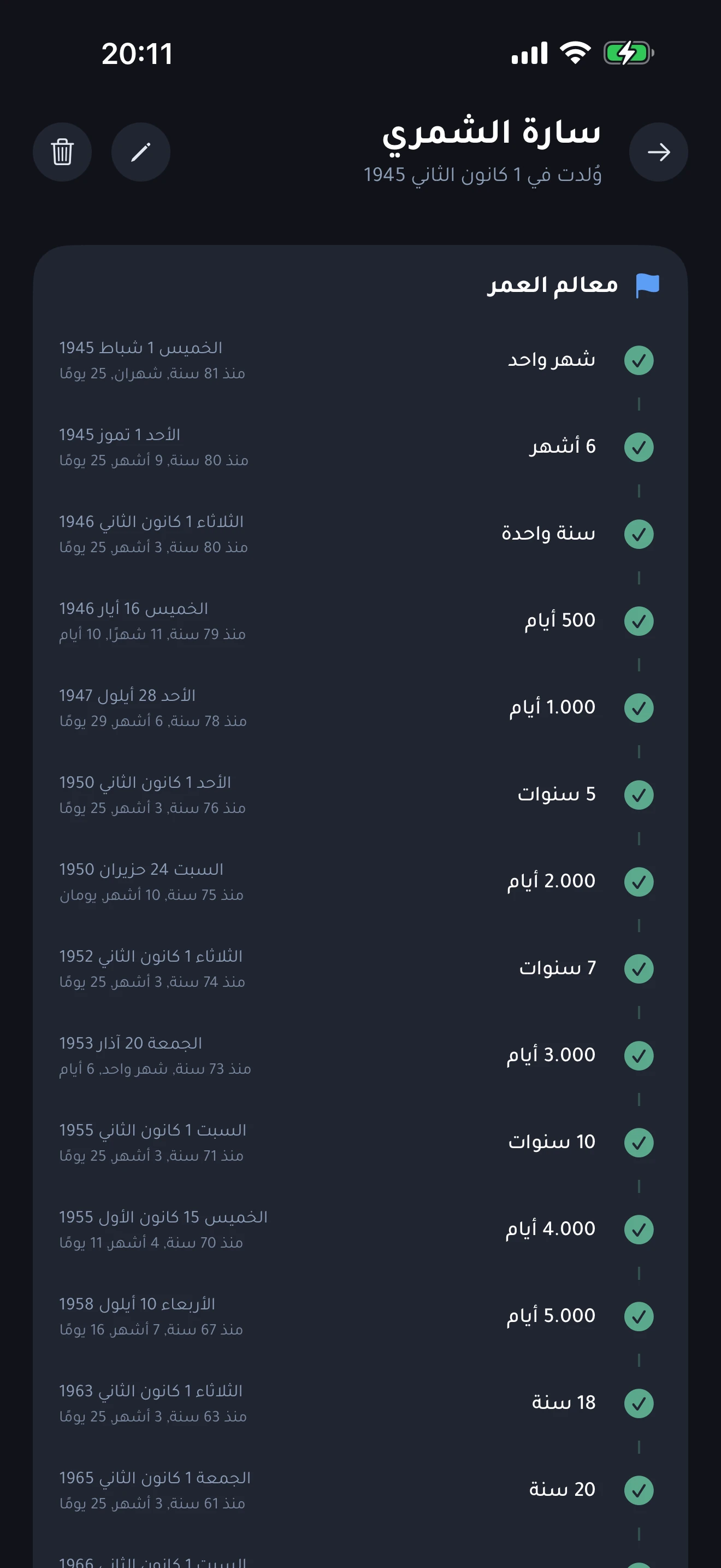 خطٌّ زمنيٌّ لمحطّات العمر، يُبيّن المحطّات المنقضية من شهرٍ واحد إلى 21 سنة (شاملًا 500 يوم، 1000 يوم، 5000 يوم، 18 سنة)، مع التاريخ والوقت المنقضي لكلّ منها