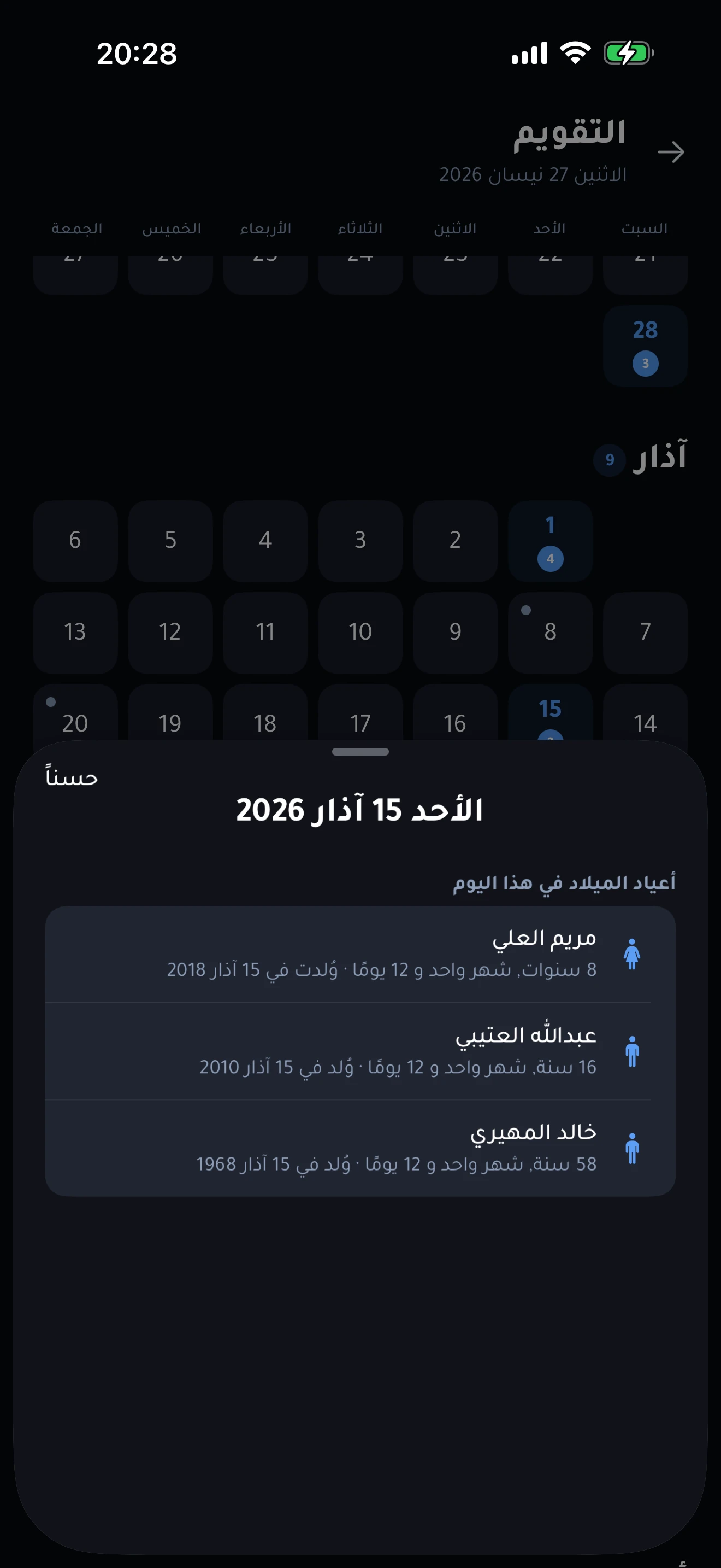 اطّلع على كلّ عيد ميلادٍ وذكرى زواجٍ ومناسبةٍ خاصّةٍ على تقويمٍ سنويٍّ بخمسة أنظمةٍ تقويميّةٍ مدعومة: الميلاديّ، الهجريّ (الإسلاميّ)، العبريّ، الفارسيّ (الهجريّ الشمسيّ)، والبوذيّ. اضغط على أيّ يومٍ لترى من له مناسبةٌ فيه.
