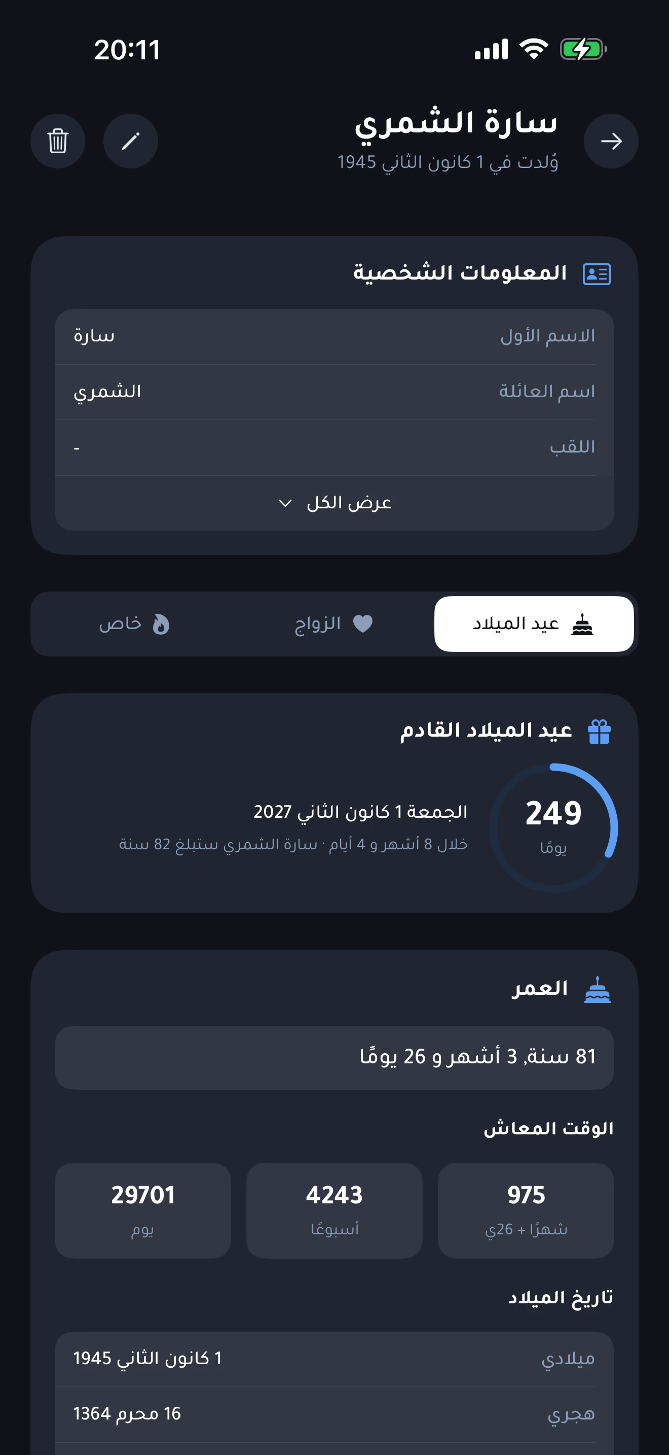 أنشِئ بطاقاتٍ بتاريخ الميلاد والاسم والجنس والكُنية ورقم الهاتف والبريد الإلكترونيّ وفصيلة الدمّ. يَعرض التذكيرُ المناسباتِ القادمة بنظرةٍ واحدة، مع حلقاتِ تقدُّمٍ بالأيّام المتبقّية، والعمر الحاليّ التفصيليّ بالسنوات والأشهر والأيّام.