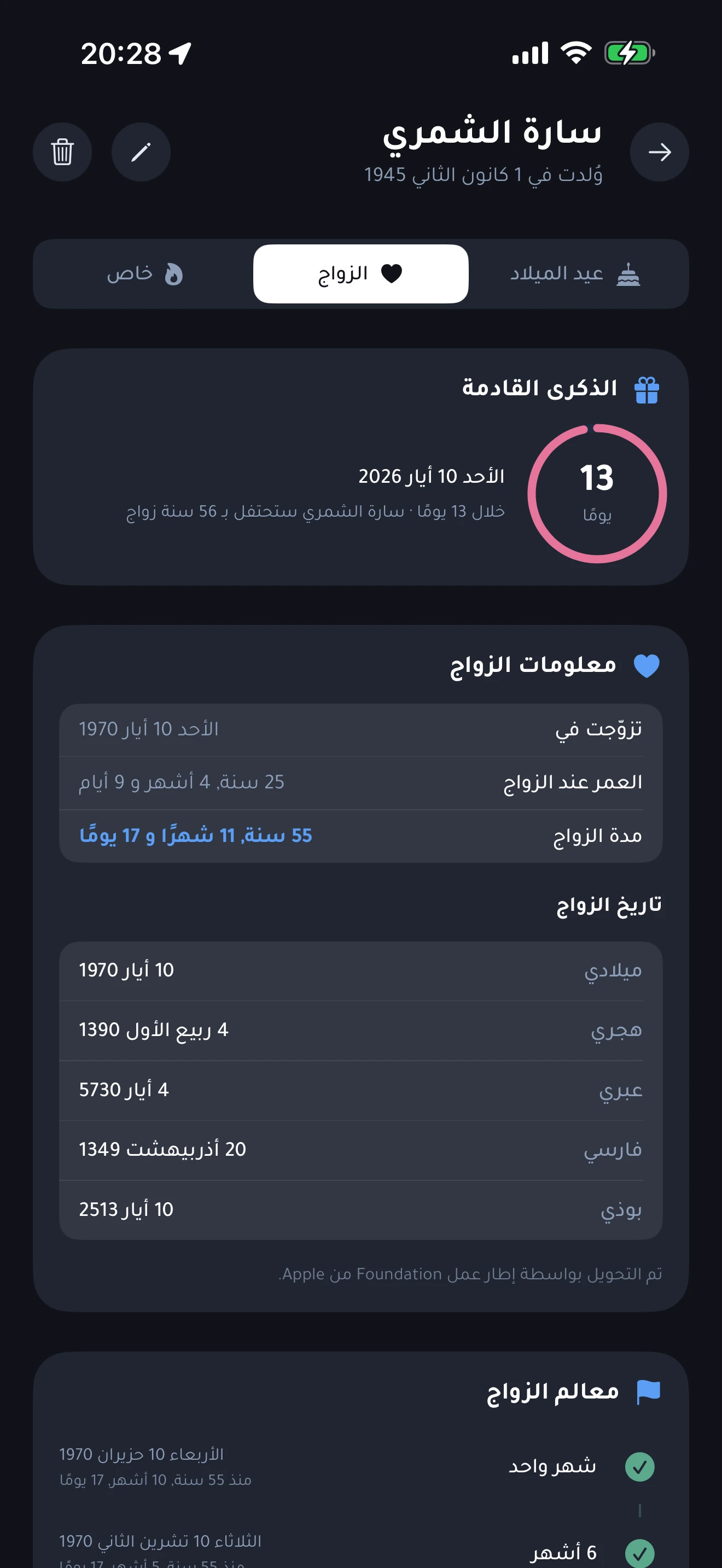 تابِع تواريخ الزواج إلى جانب أعياد الميلاد. يُظهر متعقّبُ ذكرى الزواج عددَ سنوات الزواج لكلّ زوجَيْن، والعمر يومَ الزواج، والمحطّات، والذكرياتِ القادمة، بحلقةٍ ورديّةٍ خاصّة وعلامة تبويبٍ مستقلّةٍ لكلّ التفاصيل.
