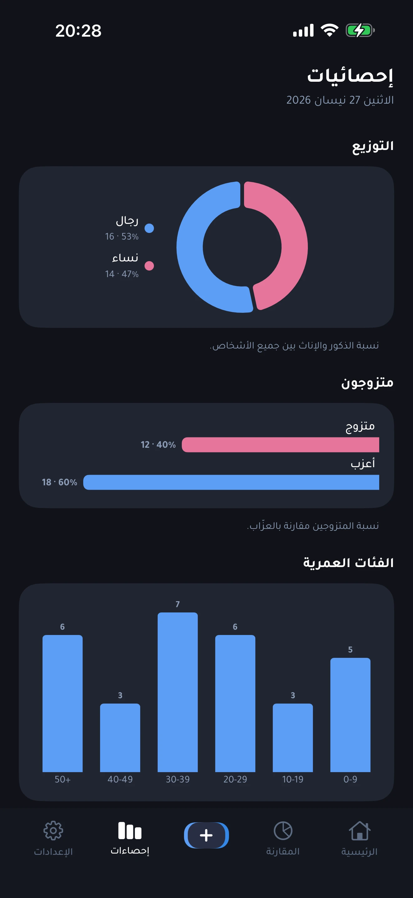 علامة تبويب الإحصائيّات مع رسم دونات لتوزيع الجنس، ورسم شريطيّ للمقارنة بين البطاقات المتزوّجة وغيرها، ومدرَّج تكراريّ للفئات العمريّة بالعقود، تُحسب جميعها على الجهاز