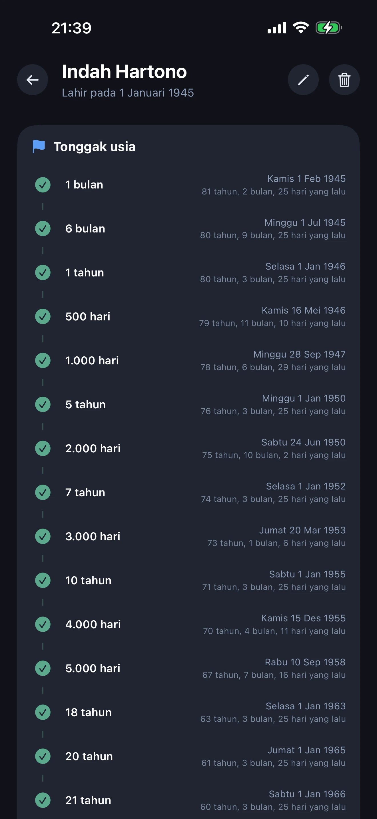 Ya. Kalkulator usia bawaan menampilkan usia tepat setiap orang dalam tahun, bulan, dan hari, serta hari, minggu, dan bulan yang telah dijalani. Fitur perbandingan usia juga memungkinkan menempatkan beberapa orang berdampingan pada garis waktu interaktif.
