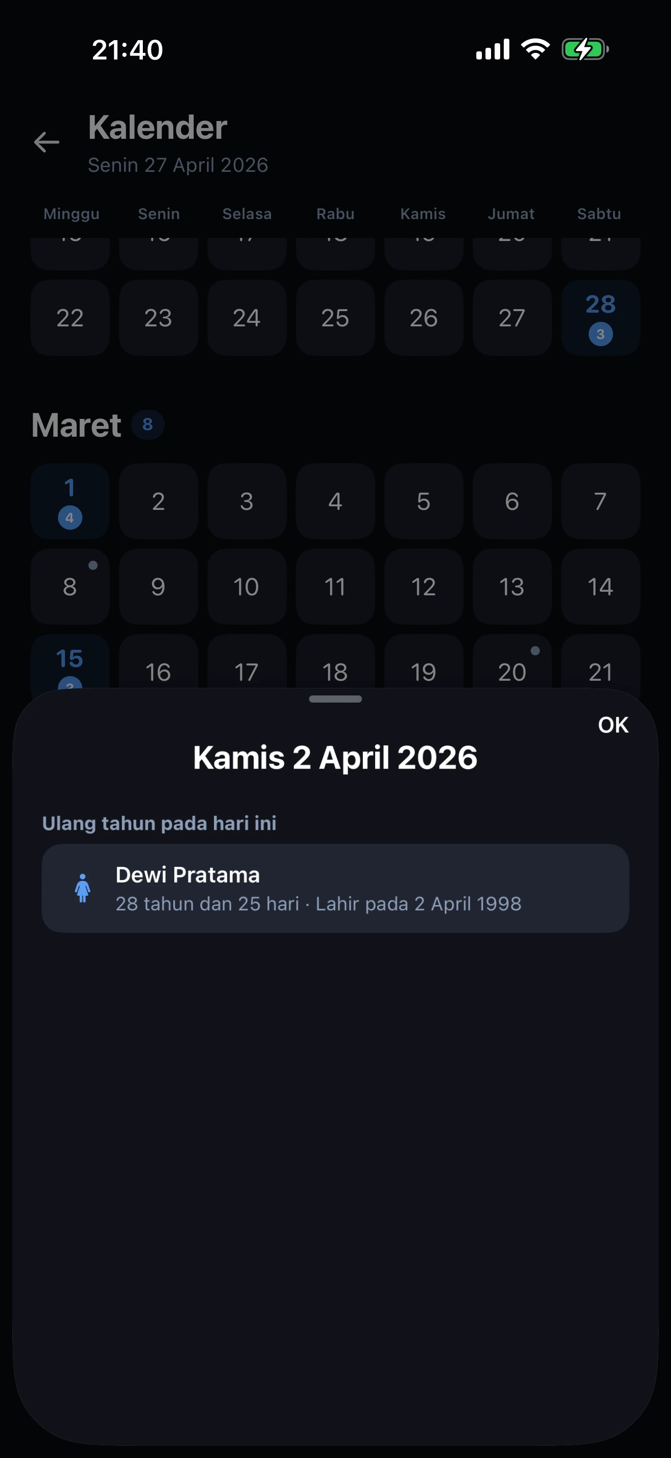 Ya, dalam dua ukuran. Widget kecil menampilkan hitung mundur ulang tahun hingga acara berikutnya dengan header tanggal. Widget sedang menampilkan mini-kalender bulanan dengan setiap hari diberi warna sesuai jenis acara (biru untuk ulang tahun, merah muda untuk pernikahan, oranye untuk acara spesial, ungu untuk hari campuran), ditambah pratinjau acara berikutnya. Keduanya diperbarui otomatis pada tengah malam.
