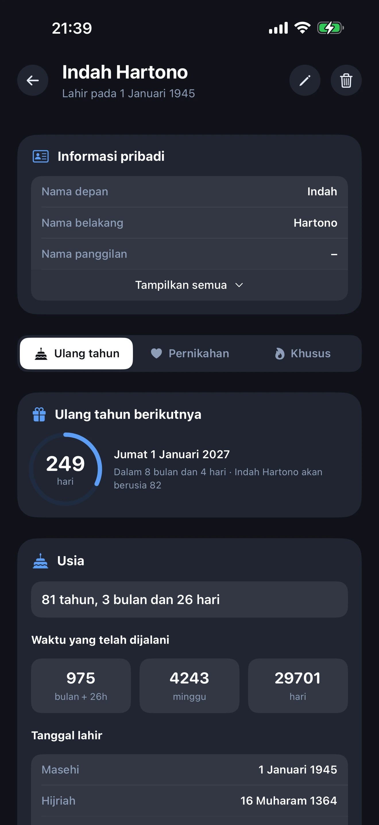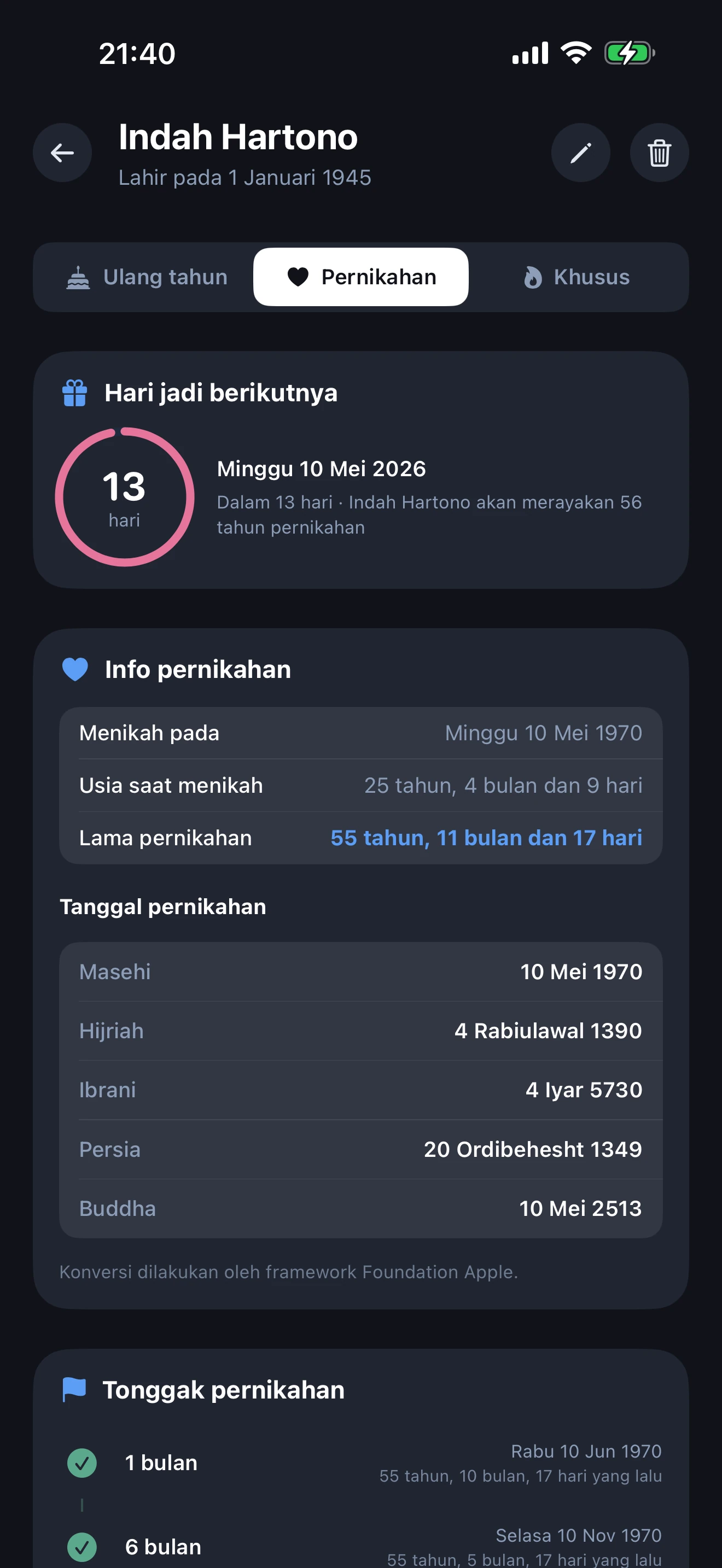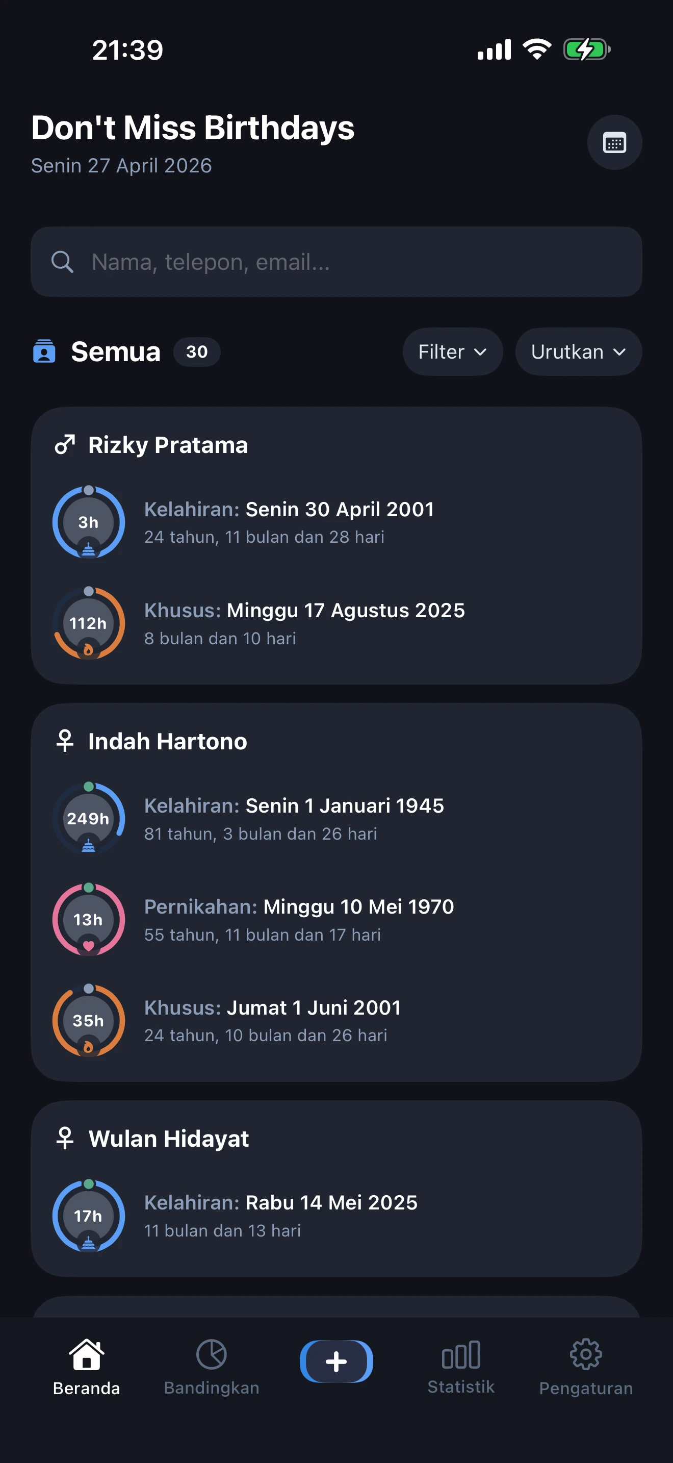 Ya. Setiap profil menampilkan cincin hitung mundur ulang tahun langsung dengan jumlah hari yang tepat hingga ulang tahun, hari pernikahan, atau acara spesial berikutnya. Widget layar utama menampilkan hitung mundur tanpa membuka aplikasi.