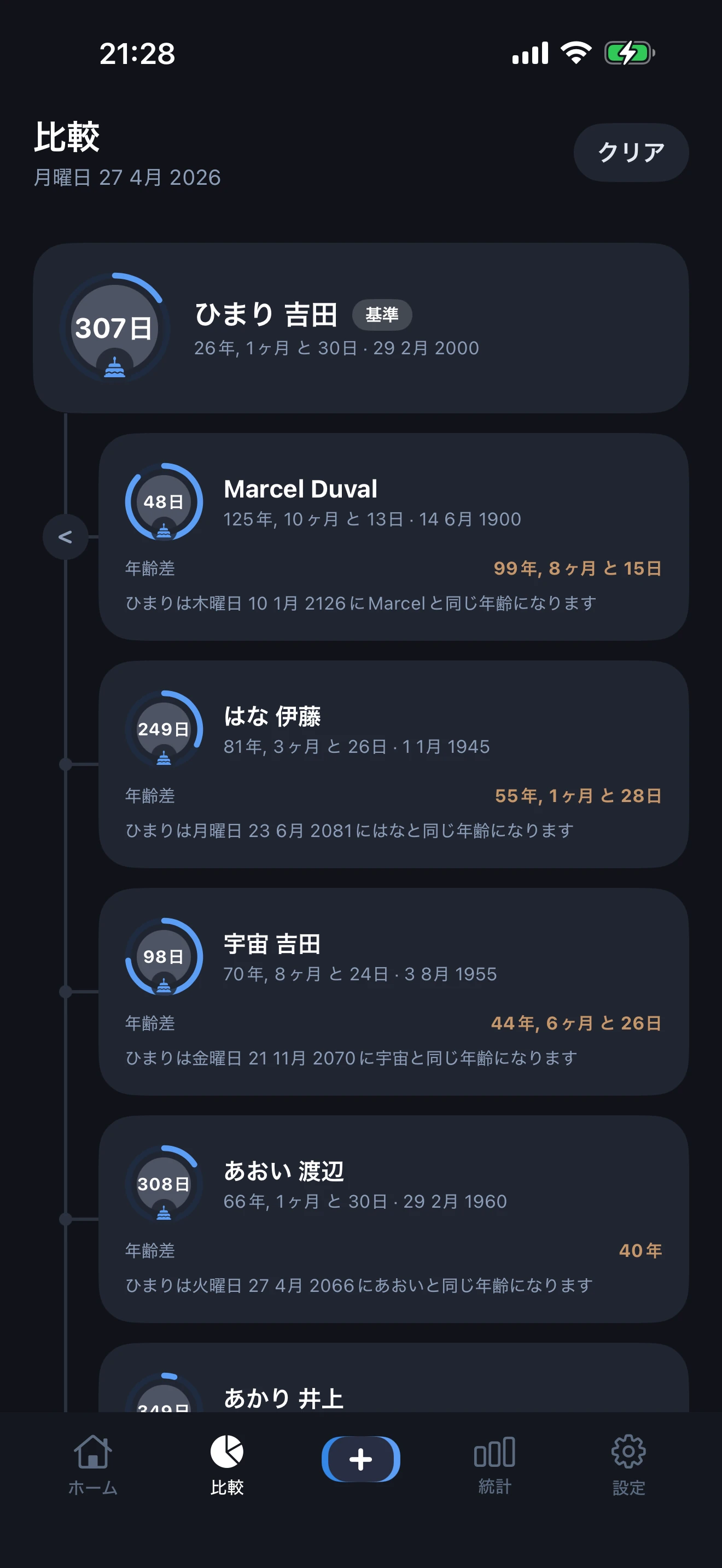 内蔵の年齢計算機は、すべての人物の正確な年齢を年・月・日で表示し、生きてきた日数・週数・月数も表示します。インタラクティブなタイムラインで複数の人物の年齢を比較し、正確な差を一目で確認できます。
