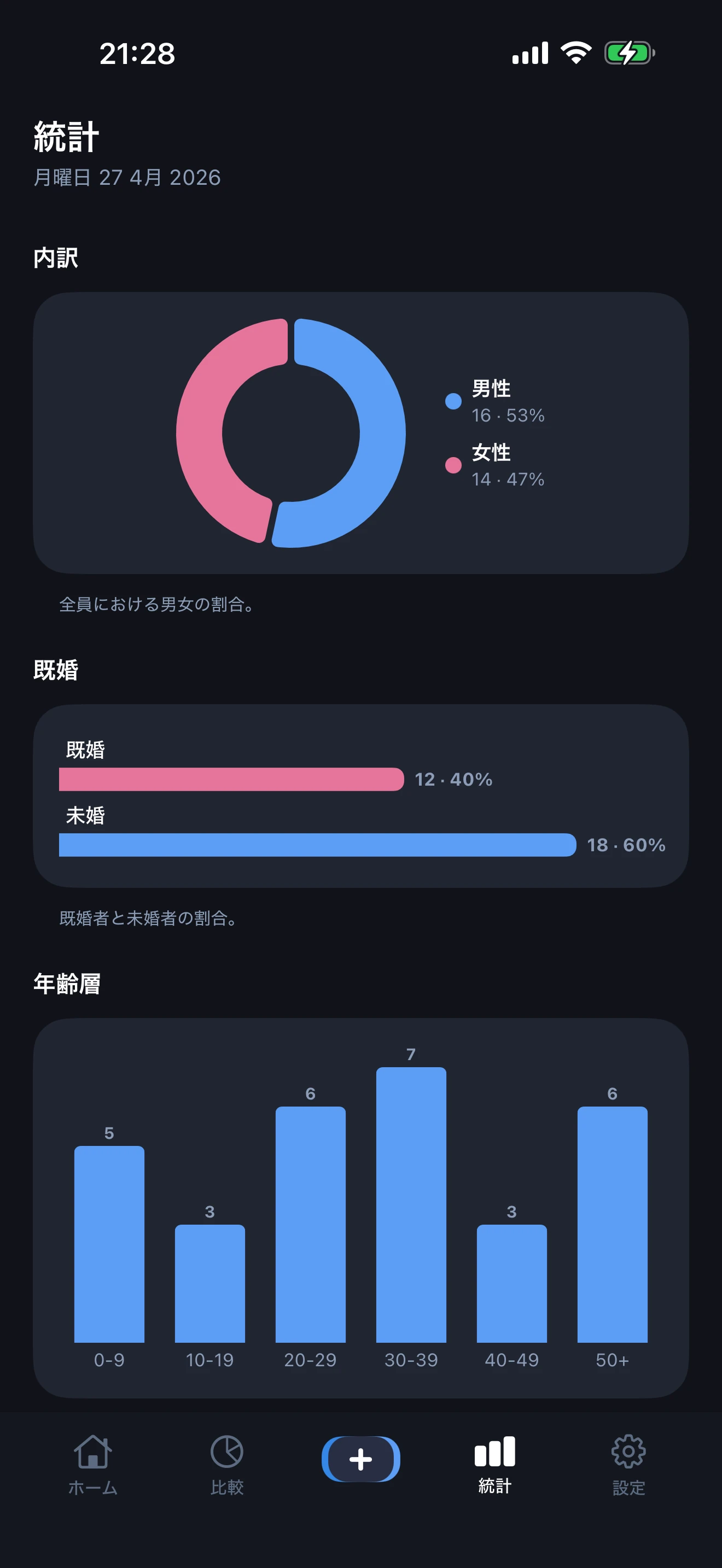 統計タブを開いてフル幅チャートを確認:性別分布、結婚比率、10 年単位の年齢層、出生曜日、月別誕生日、月別結婚、月別特別な日。プライバシーのため、すべて端末上でオフライン計算されます。