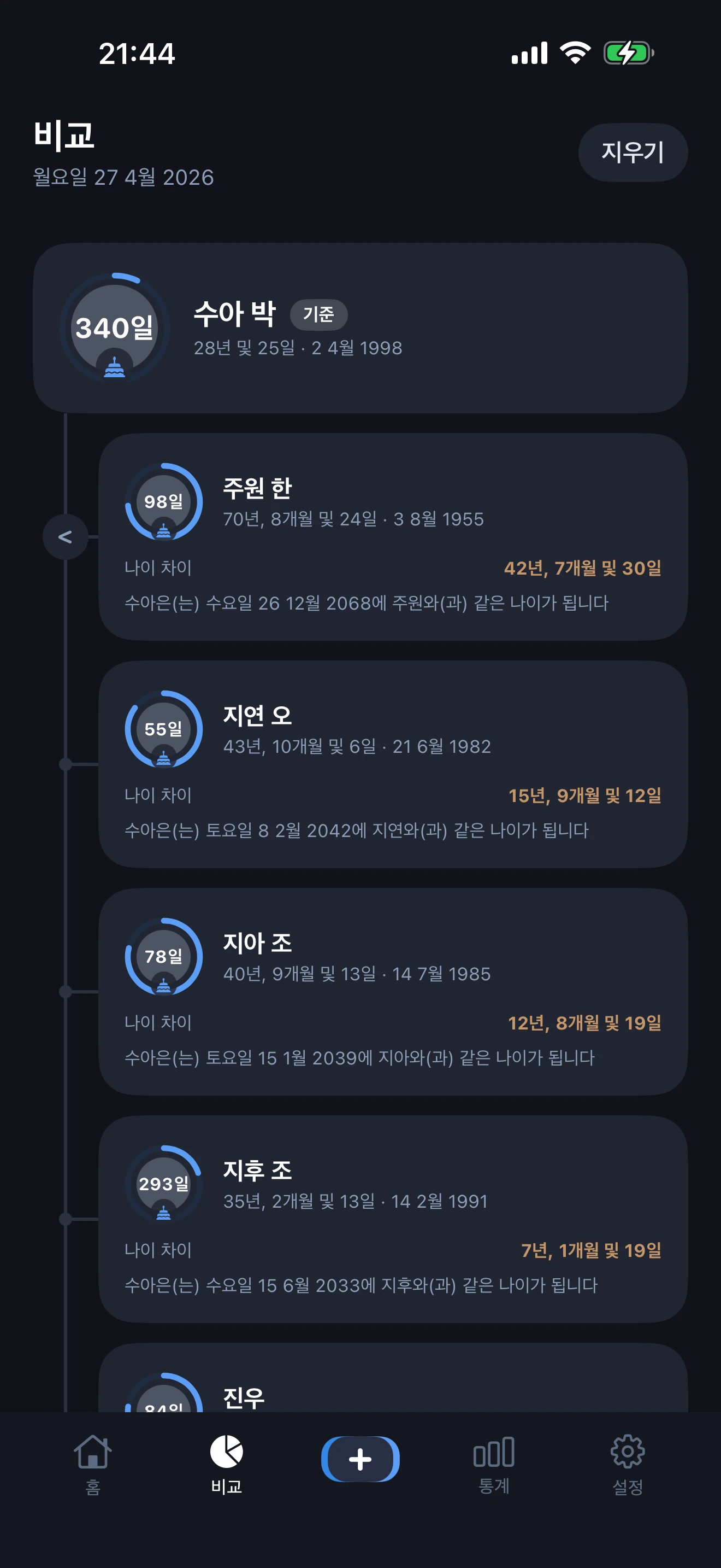 네. 내장 나이 계산기는 모든 사람의 정확한 나이를 연·월·일로, 살아온 일수·주수·월수와 함께 표시합니다. 나이 비교 기능을 사용하면 인터랙티브 타임라인에 여러 사람을 나란히 배치할 수도 있습니다.