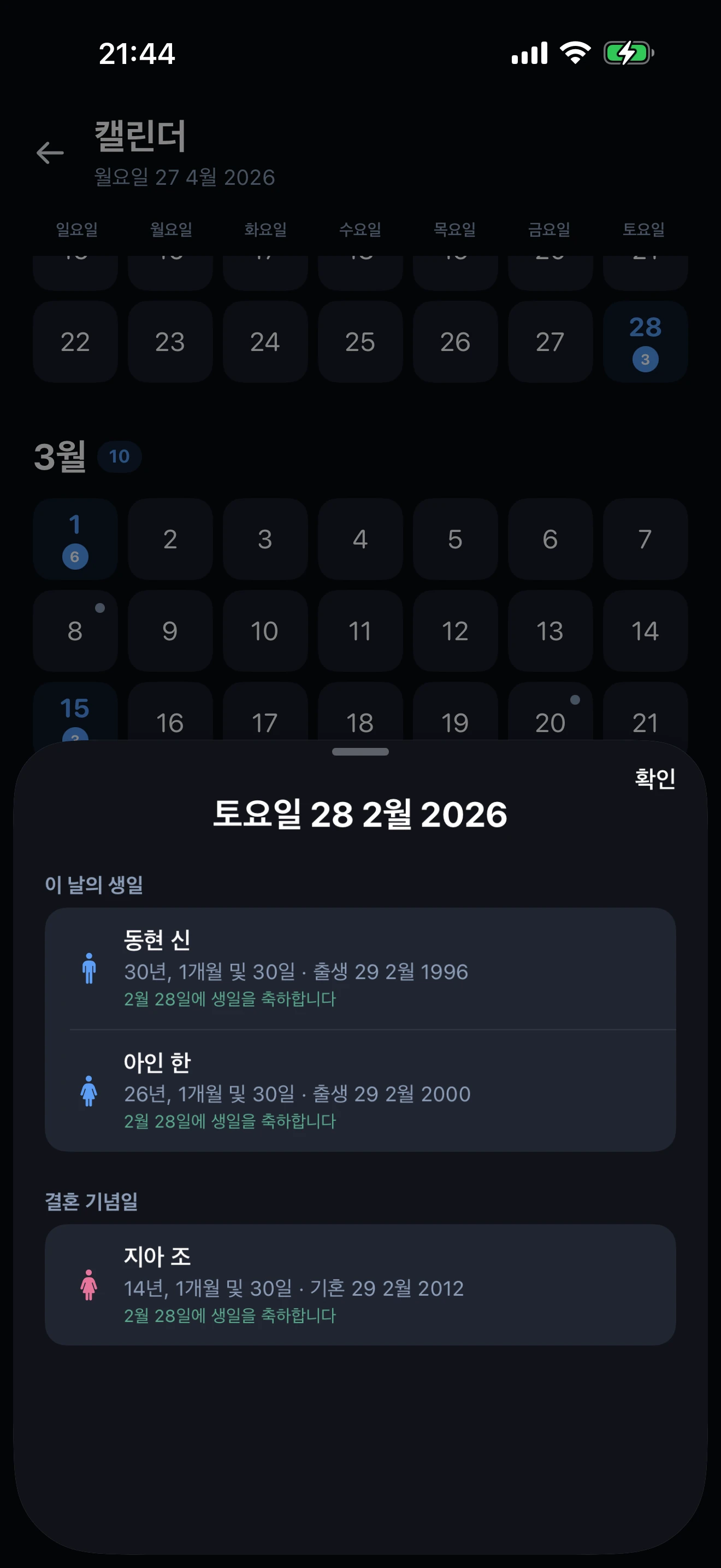 2월 29일에 태어났나요? 프로필을 저장할 때 윤년이 아닌 해에 2월 28일과 3월 1일 중 어느 날에 기념할지 선택하세요. 앱은 매년 모든 생일, 결혼, 특별한 날을 올바르게 처리합니다.