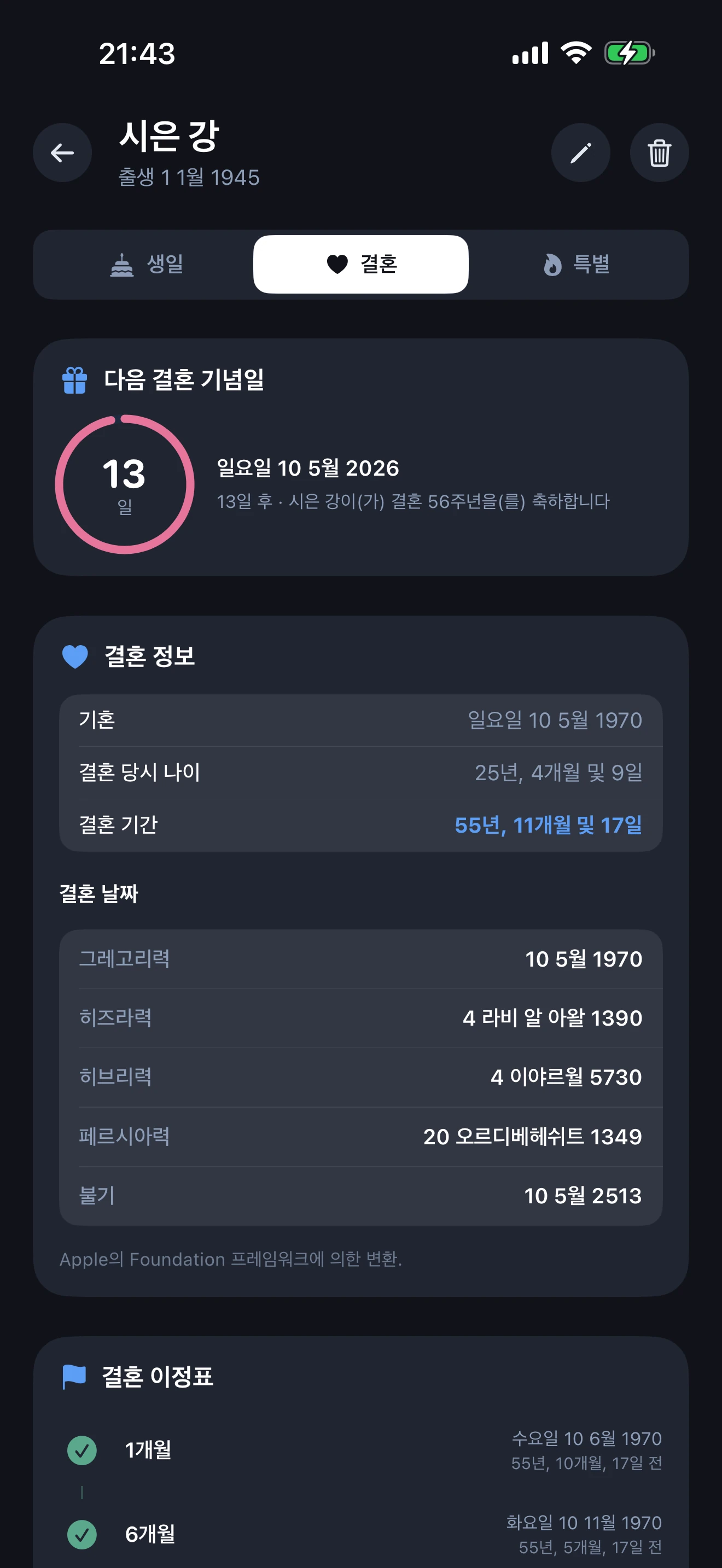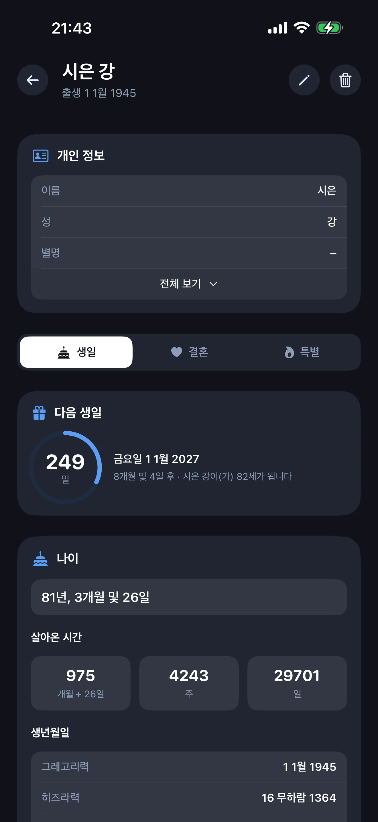 iPhone에서 가장 완성도 높은 생일 알림, 나이 계산기, 결혼기념일 추적