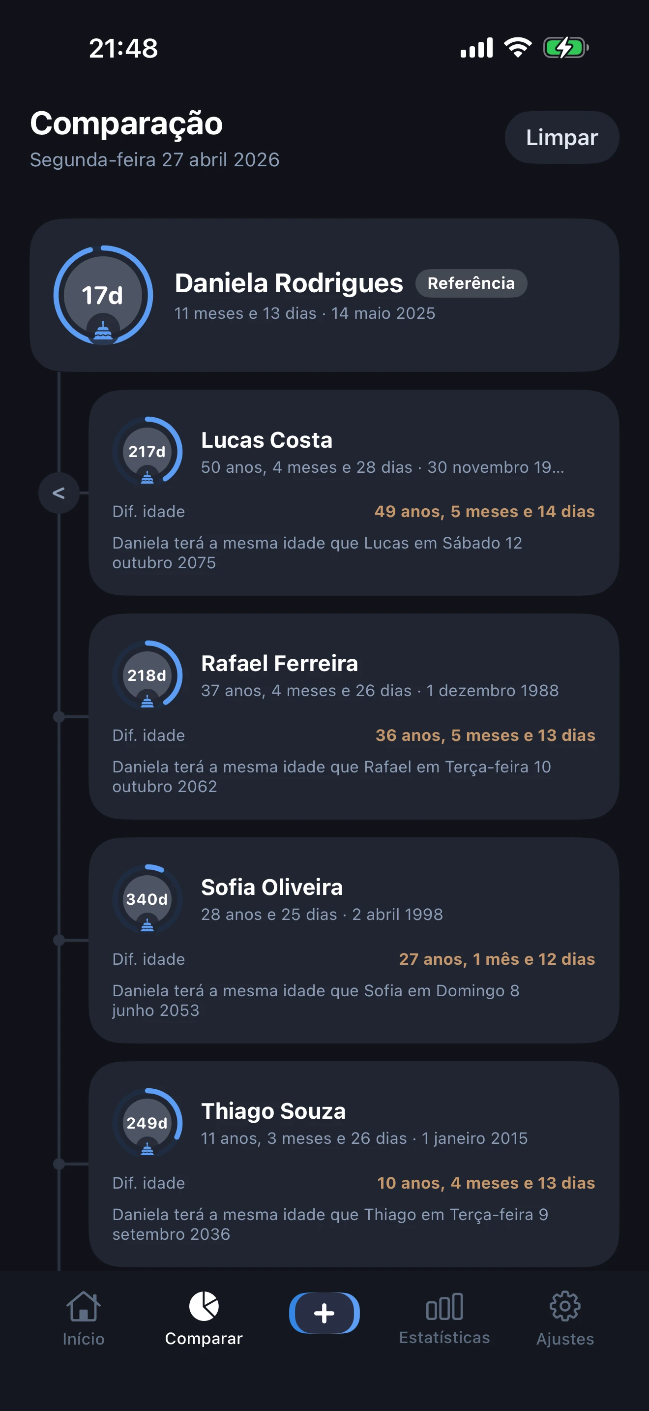 Sim. A calculadora de idade integrada mostra a idade exata de cada pessoa em anos, meses e dias, bem como o total de dias, semanas e meses vividos. A funcionalidade de comparação de idades também permite colocar várias pessoas lado a lado numa linha temporal interativa.