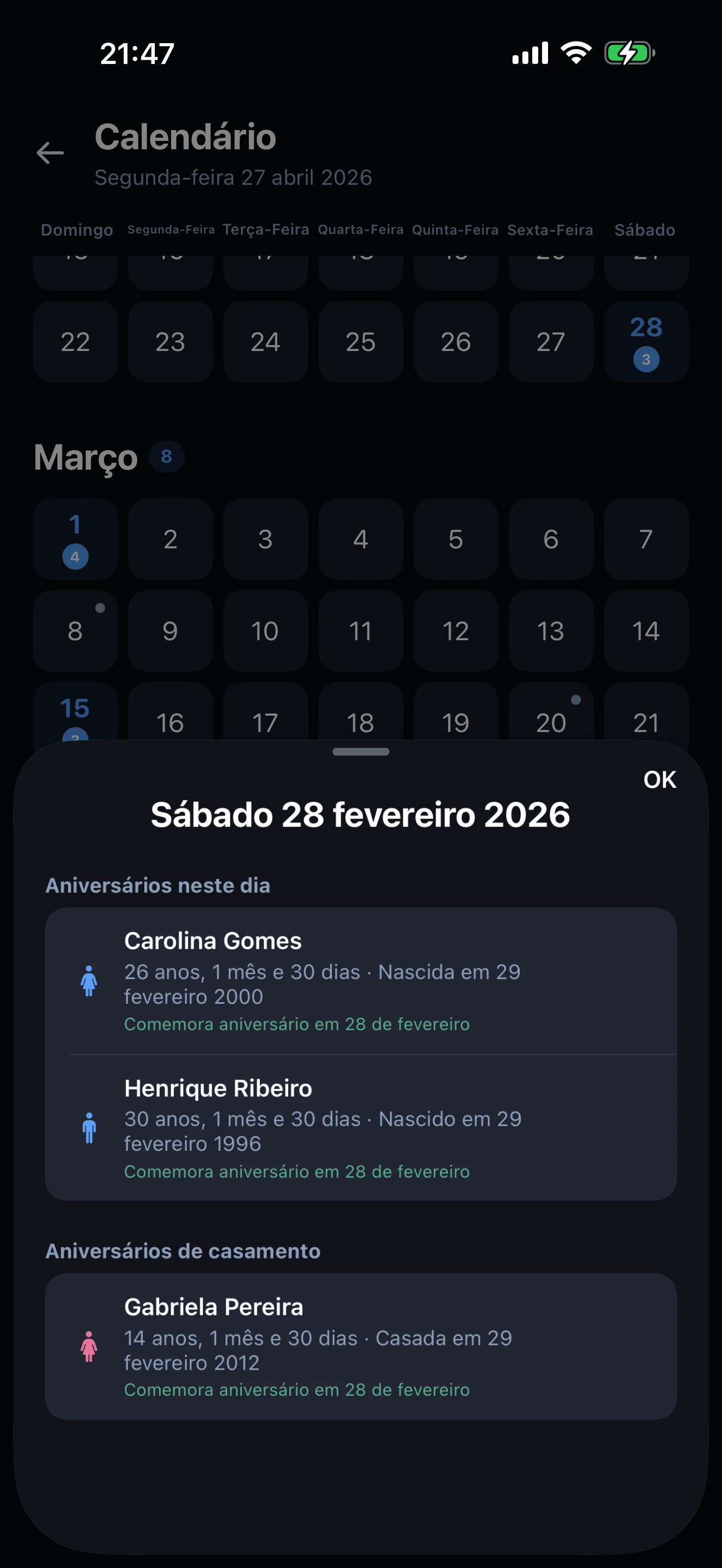 Sim. Quando guardar um perfil desses, a app pergunta-lhe se prefere o 28 de fevereiro ou o 1 de março nos anos não bissextos. A mesma opção existe para datas de casamento e de eventos especiais que caiam a 29 de fevereiro.