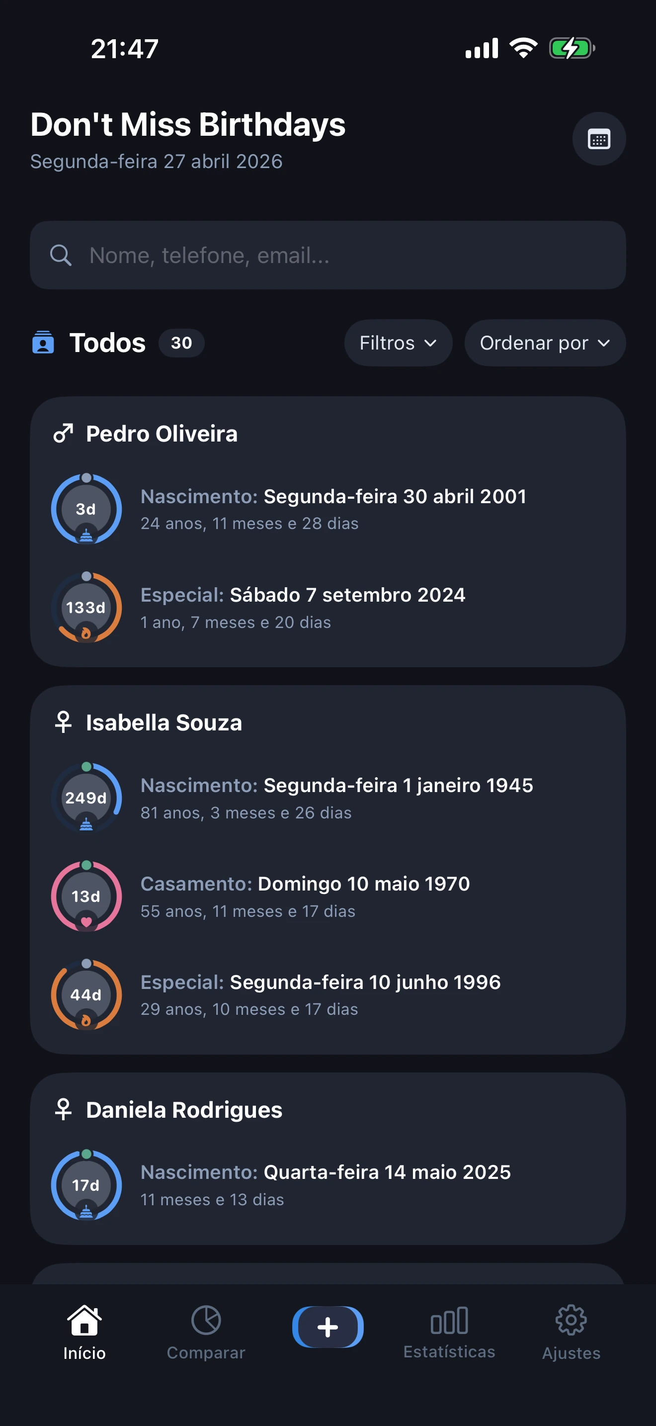 Sim. Cada perfil mostra um anel ao vivo de contagem decrescente com o número exato de dias até ao próximo aniversário, aniversário de casamento ou evento especial. O widget de ecrã principal mostra a contagem decrescente sem ser preciso abrir a app.