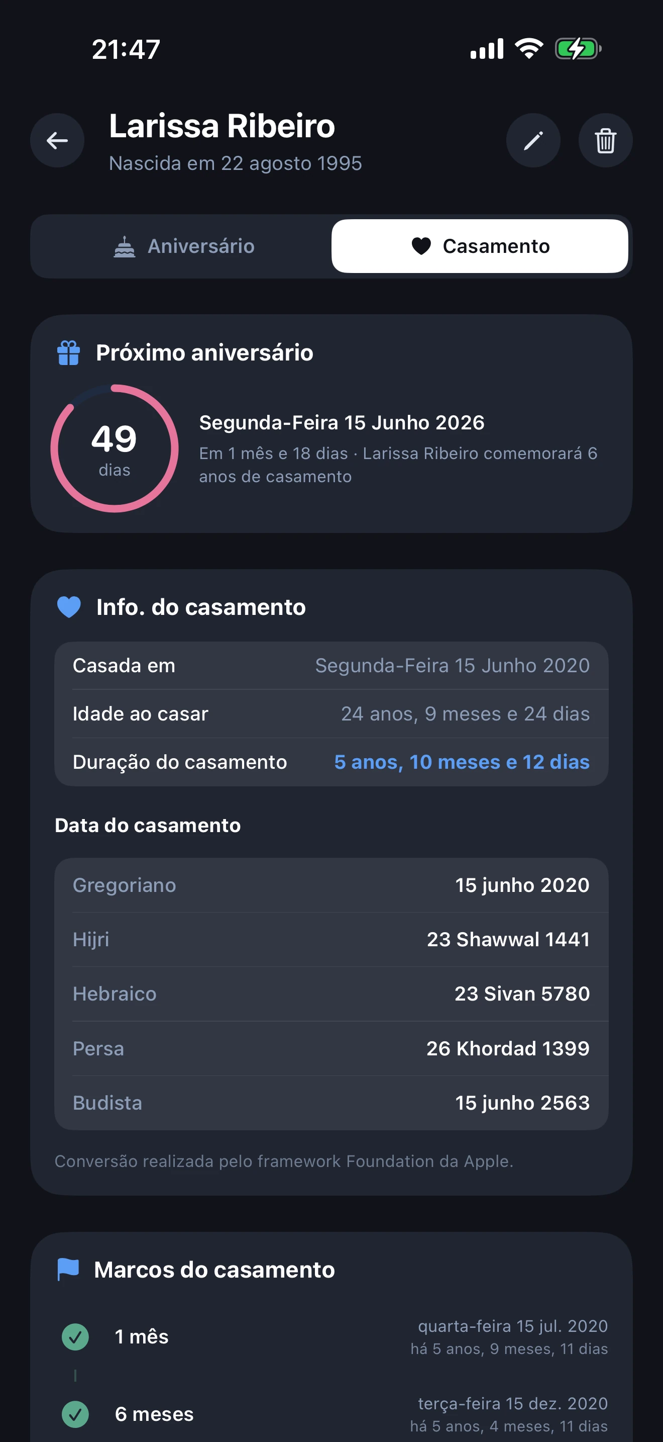 Cada perfil pode ter até três datas. Aniversário é o dia em que alguém nasceu. Aniversário de casamento regista a data do casamento e conta os anos de matrimónio. Evento especial serve para qualquer outra data importante que queira recordar, como mudança de casa, primeiro emprego, dia em que se conheceram, homenagem ou dia da adoção. Cada evento tem o seu próprio anel colorido (azul, rosa, laranja), notificação e separador de detalhes dedicado.